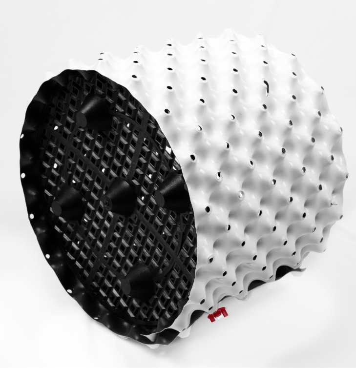 Root Control Structure Forming: Presser kontinuerligt skiftende hævede og forsænkede bølge-/fremspringsstrukturer på pladematerialet og udstanser ventilationshuller ved spidserne af fremspringene for at opnå en "luftbaseret rodkontrol" fysisk rodkontroleffekt.