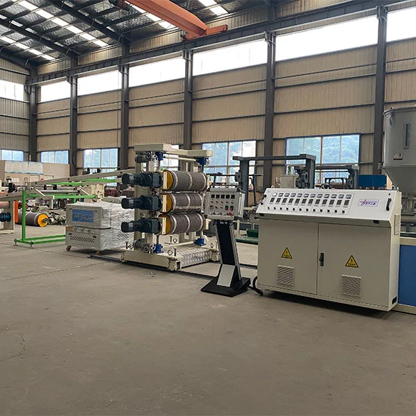 De tørrede PS -partikler transporteres til ekstruderhopperen gennem en automatisk fodringsenhed. Ekstruderskruen smelter gradvist de faste PS -partikler i en ensartet smelte gennem rotation og ekstern opvarmning. Smeltet skubbes til T-DIE (flad strømningskanal) for at foreløbigt bestemme arkets bredde. Smeltfilmen kommer ind i den tre-rulle kalender og størknes hurtigt og dannes. Det formede ark trækkes med en ensartet hastighed af trækkraftmaskinen, og burrerne fjernes af trimmemaskinen. Endelig rulles det ind i en almindelig spole af vinderen.